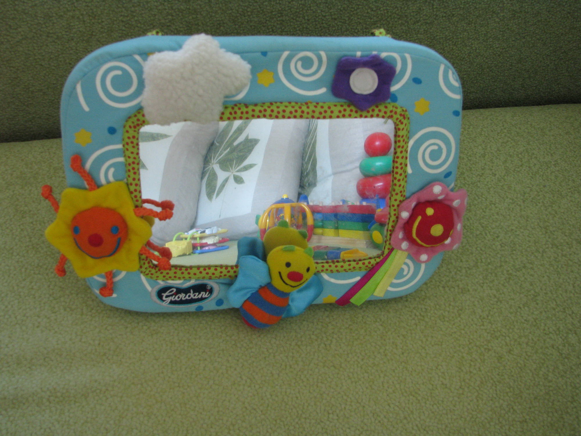 Можно поставить на пол (подпорка имеется) или подвесить на кровати (для этого есть шнурочки)